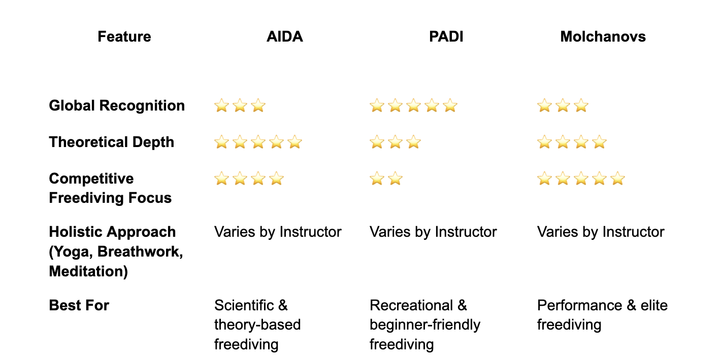 The three major freediving education systems—AIDA, PADI, and Molchanovs—each have unique structures, teaching philosophies, and career opportunities.